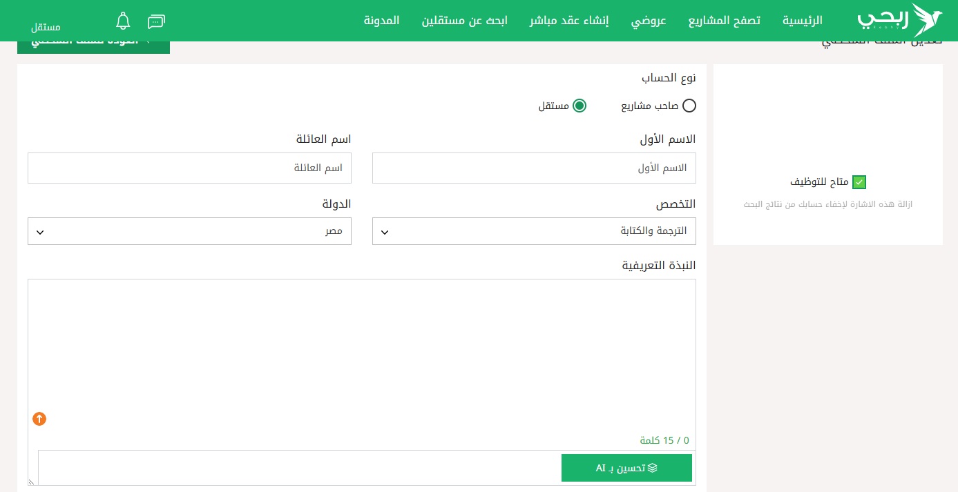 واحدة من أبرز الخطوات المهمة للمستقل ليبني حضور قوي له على منصات العمل الحر مثل ربحي هي كتابة نبذة تعريفية احترافية، ونظرًا لأن البروفايل هو أول ما ير...