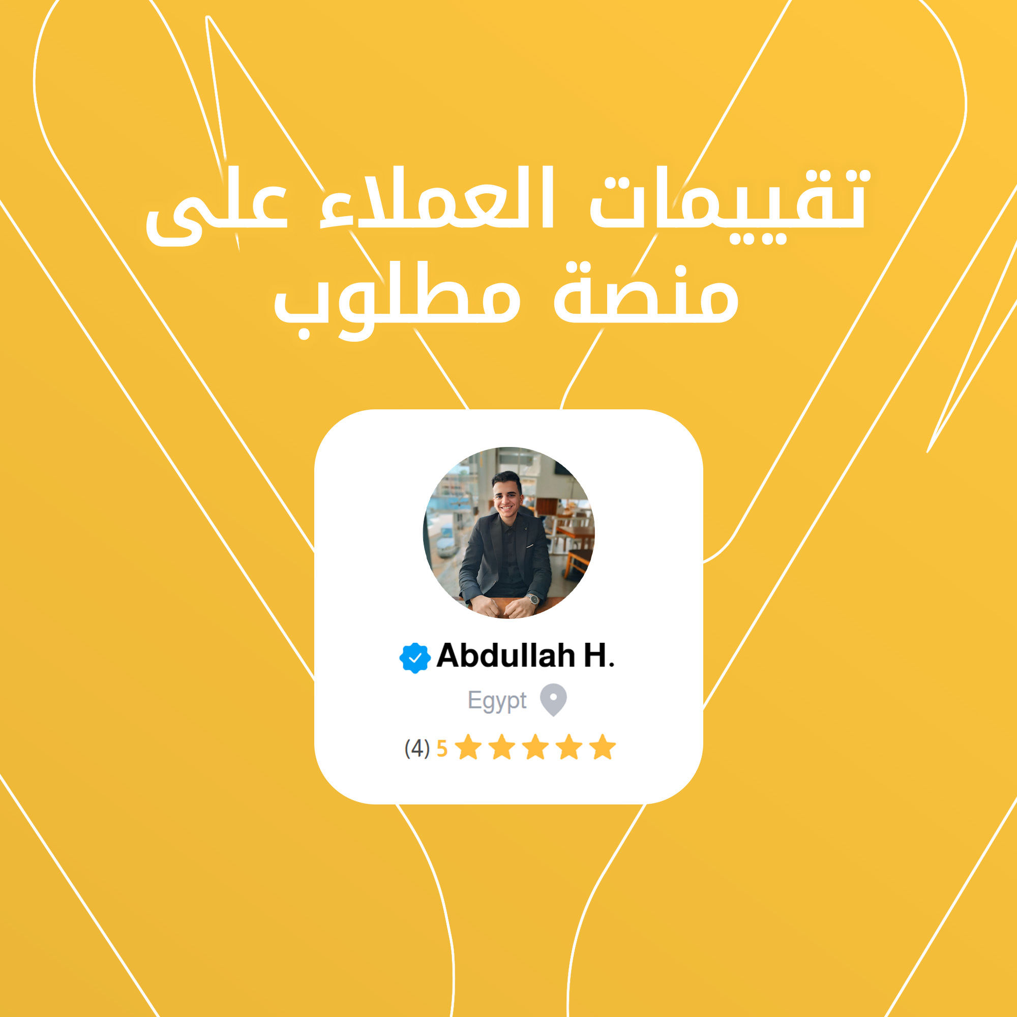 يعرض هذا التصميم مجموعة من تقييمات العملاء الحقيقية التي حصلت عليها من خلال عملي على منصة "مطلوب". يعكس التصميم آراء العملاء الذين تعاملت معهم، ويبرز مدى رضاهم عن جودة العمل، والإبداع، والاحترافية التي أقدمها في كل مشروع.