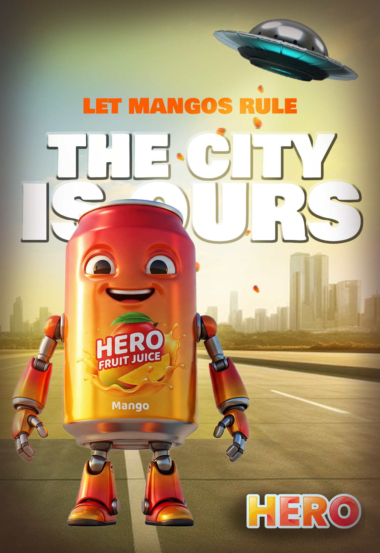 Creative 3D billboard design for a fruit juice brand featuring animated can characters, bold typography, and vibrant colors. Designed for high-impact outdoor advertising with a fun “city invasion” concept.