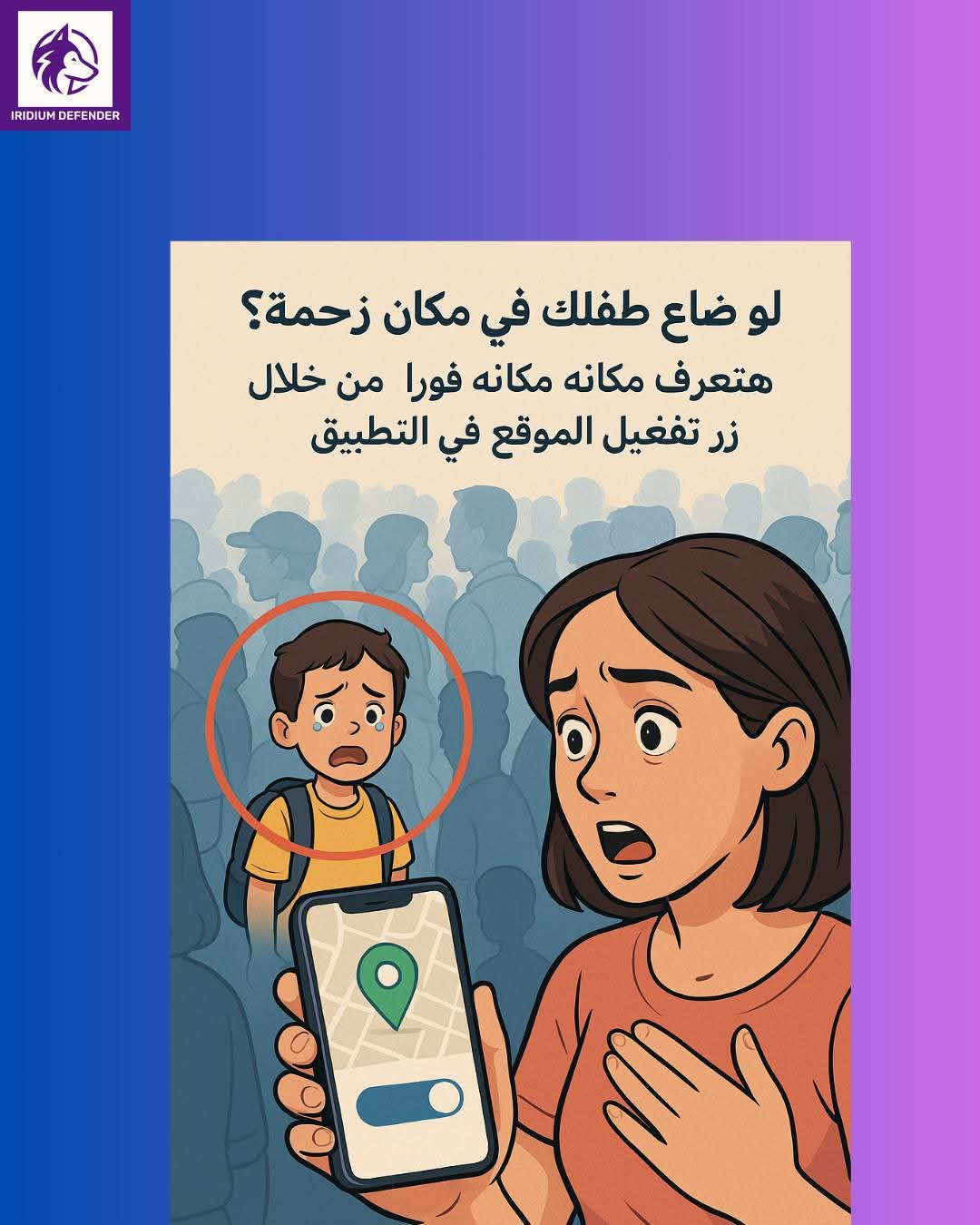 كتابة محتوي توعوي لتطبيق ايريدوم ديفندر للتوعية الآباء والأمهات بتحميل التطبيق وتفعيل زر تتبع الموقع لحماية اطفالهم