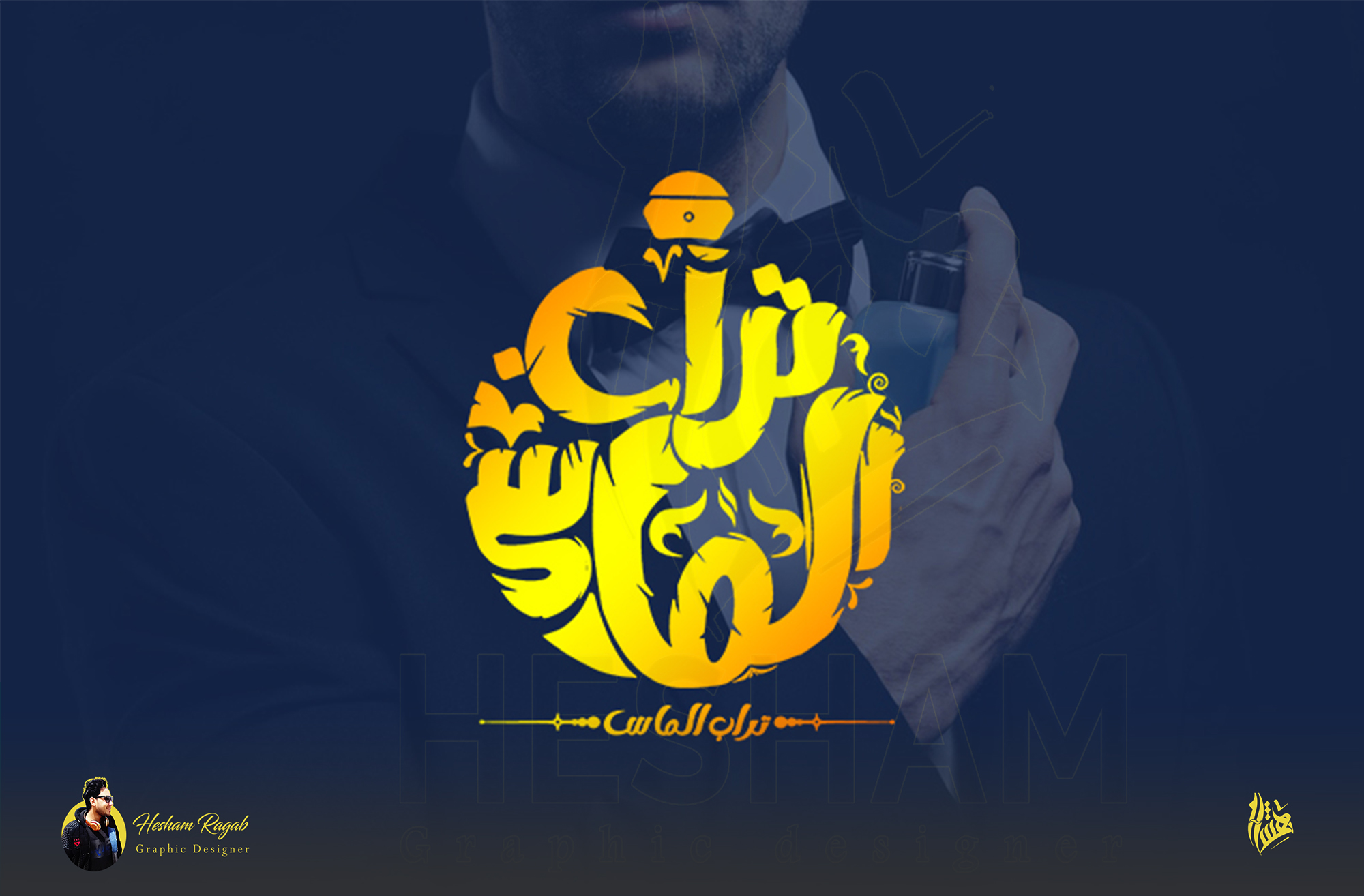 تصميم شعار وهويه بصريه لمشروع عطور تراب الماس باستخدام الخط العربي الحر في تصميم الشعار وتصميم كلمة تراب الماس علي شكل زجاجة عطور دائريه