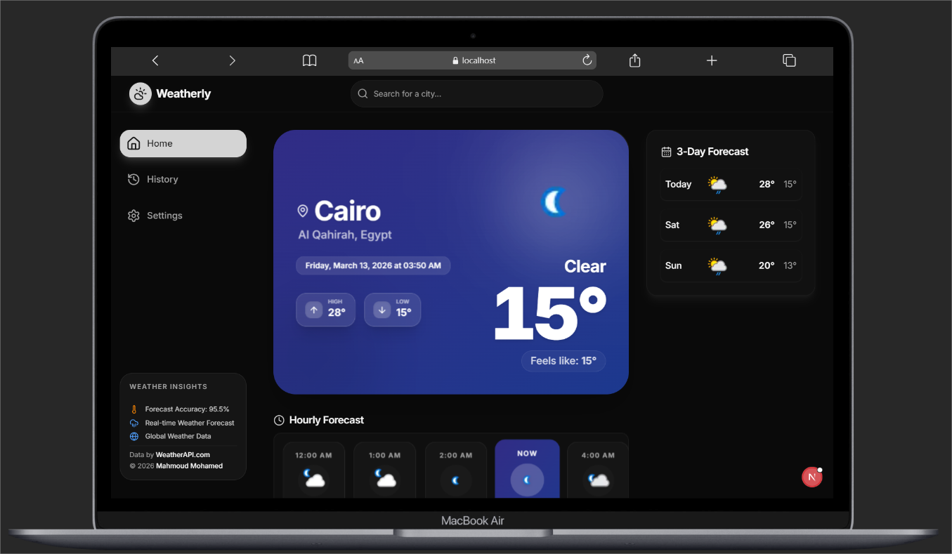 قمت بتطوير تطبيق ويب حديث ومتكامل لعرض معلومات الطقس بشكل تفاعلي وسريع، بهدف تزويد المستخدمين بإمكانية البحث عن أي مدينة حول العالم والحصول على بيانات الطقس الحالية وتوقعاتها المستقبلية بطريقة واضحة وسهلة الاستخدام. صممت التطبيق ليكون لوحة تحكم تفاعلية توفر تجربة مستخدم سلسة وغنية بالمعلومات.