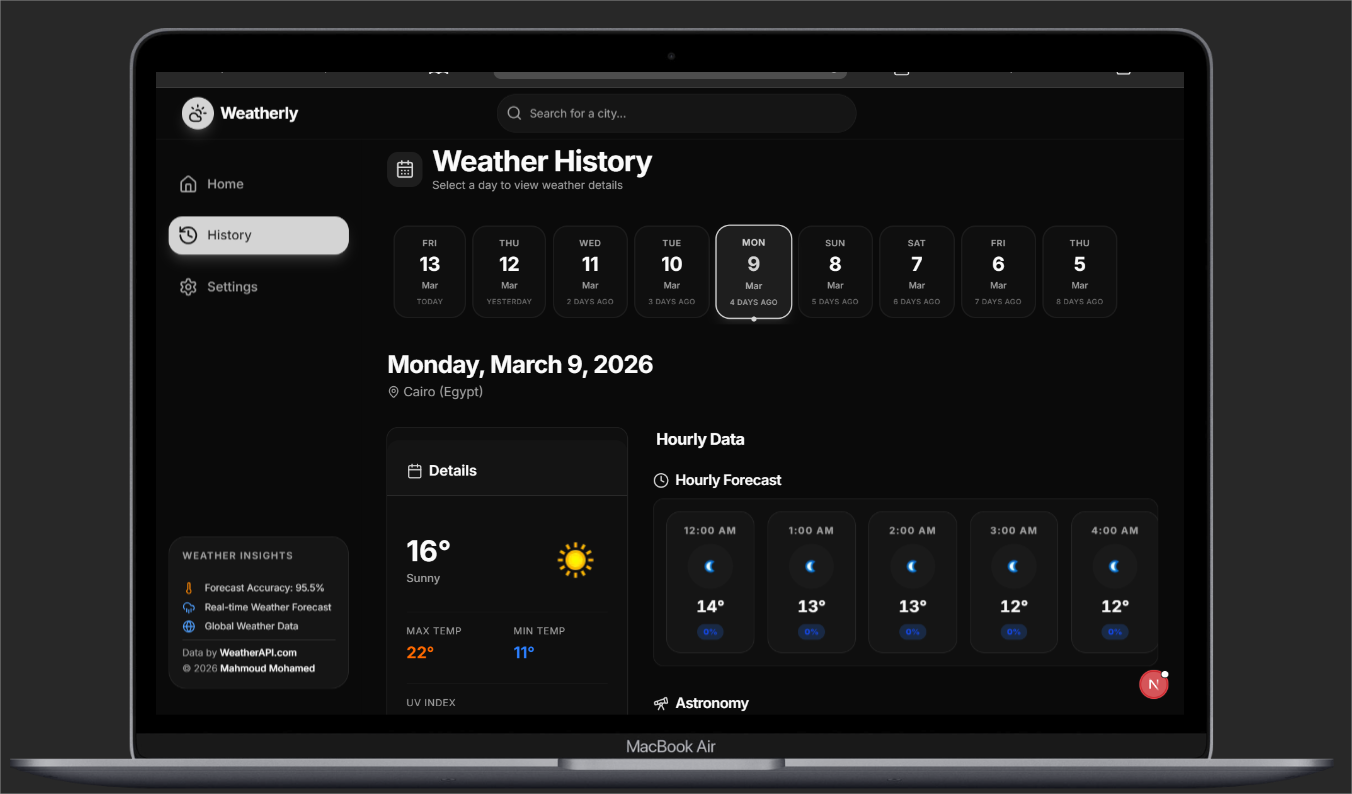 اعتمدت في بناء هذا التطبيق على أحدث التقنيات مثل Next.js وTypeScript وTailwind CSS، مع دمج ناجح لواجهات برمجة تطبيقات (APIs) خارجية موثوقة لضمان دقة البيانات. تُبرز هذه الحلول المتقدمة قدرتي على تطوير تطبيقات ويب عالية الأداء، مرنة، وسهلة الاستخدام، تلبي احتياجات المستخدمين المتنوعة وتوفر تجربة رقمية متميزة.