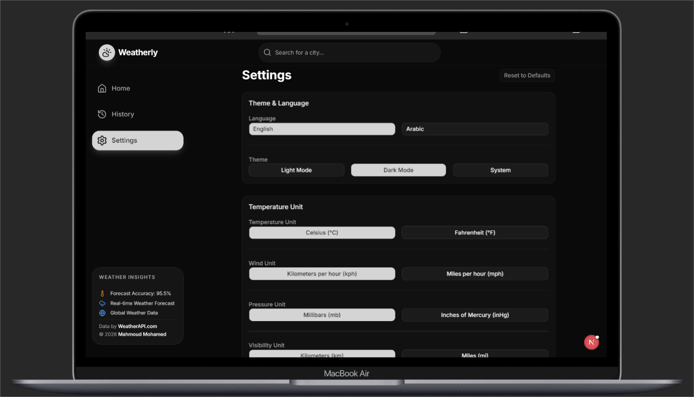 - عرض دقيق وشامل لحالة الطقس الحالية لأي مدينة عالمياً.
