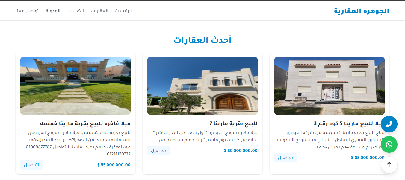يتيح الموقع تصفح مجموعة متنوعة من العقارات السكنية والتجارية مع عرض التفاصيل الأساسية لكل عقار مثل الموقع، السعر، المساحة، والمواصفات. كما تم تصميم الموقع بواجهة بسيطة وسهلة الاستخدام تساعد الزائر على الوصول إلى العقار المناسب بسرعة.