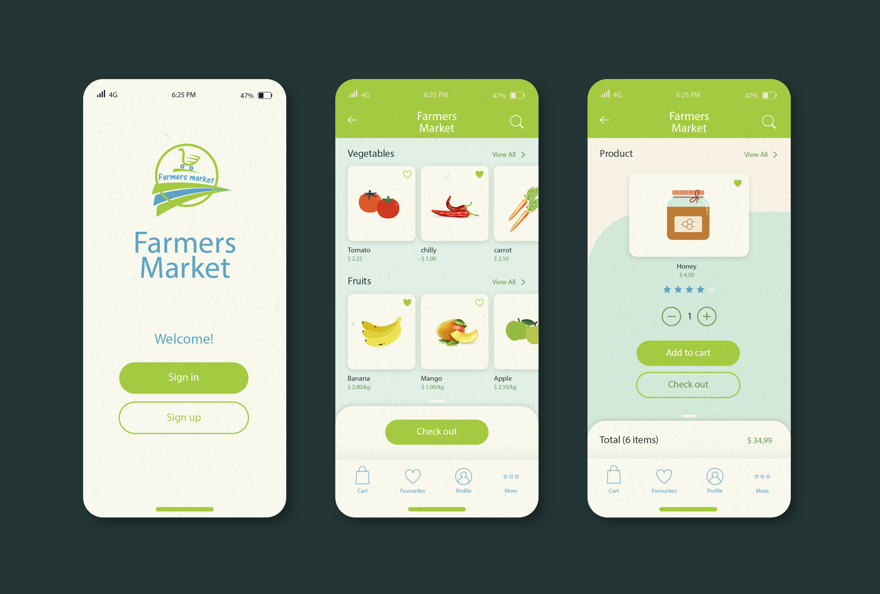 قمت بتصميم الهوية البصرية وواجهة المستخدم (UI) لتطبيق Farmers Market، وهو مشروع محوري يهدف إلى ربط المزارعين مباشرة بالمستهلكين، مما يتيح لهم بيع منتجاتهم الطازجة بكل سهولة ويسر. كان الهدف الأساسي هو إنشاء منصة رقمية جذابة وبديهية تعزز التجارة المحلية وتوفر تجربة مستخدم سلسة لكل من البائع والمشتري.