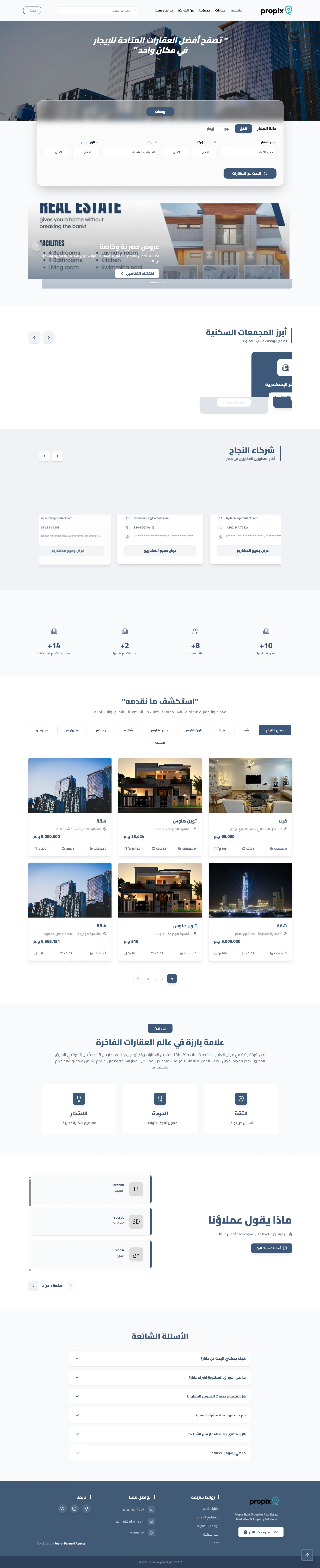 أقسام مميزة: تضم أحدث الوحدات المضافة، العقارات المميزة (Premium)، وسجل الأعمال والمشاريع المكتملة.