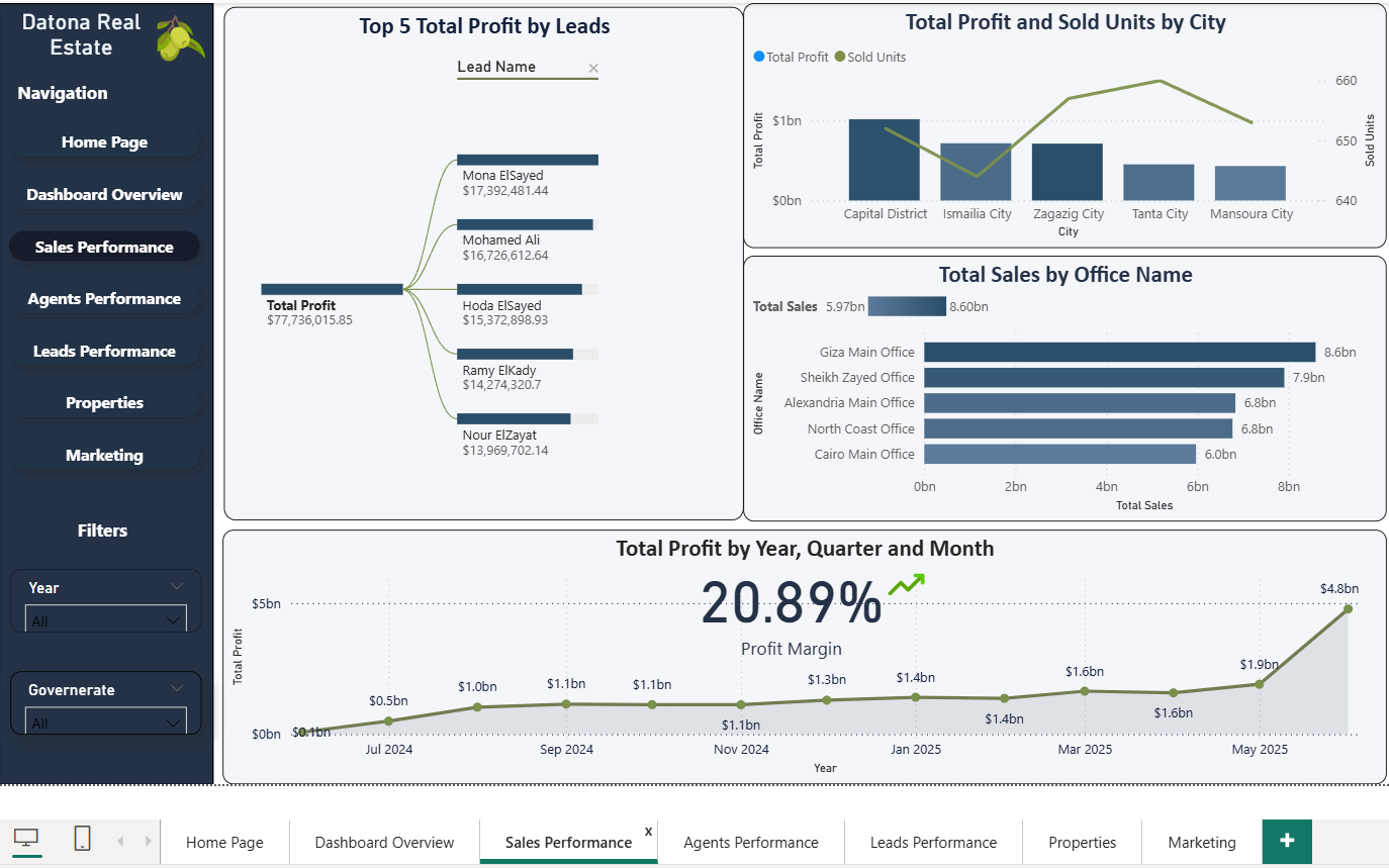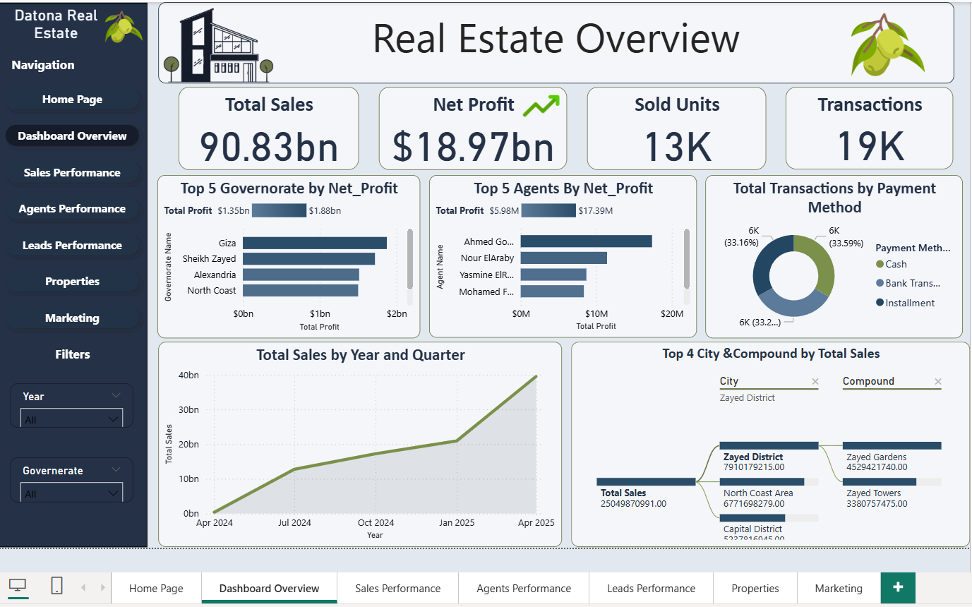 تصميم وبناء لوحة معلومات (Dashboard) تفاعلية وشاملة لشركة عقارات (Datona Real Estate) باستخدام برنامج Power BI، بهدف تتبع أداء المبيعات وتحليل الأرباح.