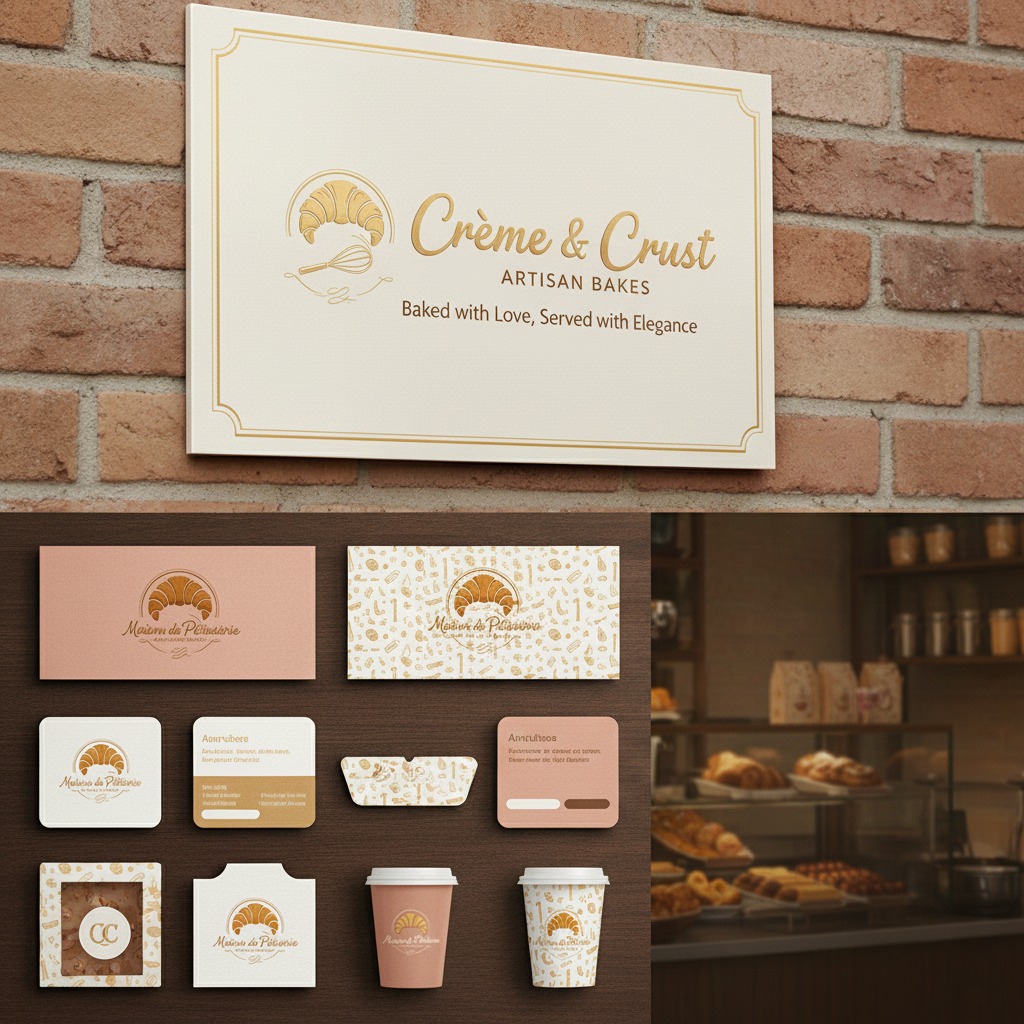تم العمل على بناء هوية بصرية متكاملة لبراند "Crème & Crust"، وهو بوتيك حلويات فاخر (Artisan Pastry) متخصص في تقديم المعجنات الفرنسية الراقية مثل الكرواسون، الإكلير، والماكرون. الهدف كان خلق انطباع يجمع بين الفخامة العصرية والدفء الذي يوحي بالطراوة والجودة العالية.
