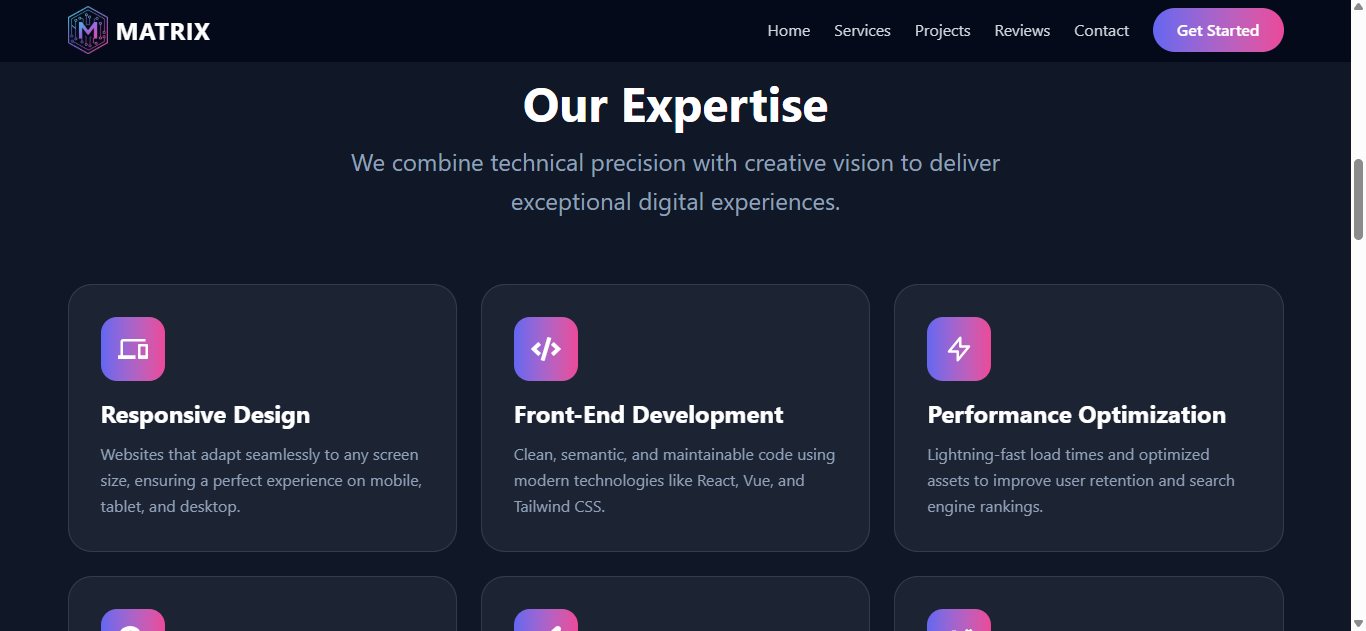 قمت بتصميم واجهة موقع "Matrix Agency"، وهو مشروع تصميم واجهة أمامية (Front-End) احترافي يهدف إلى تقديم نموذج عصري وجذاب لمواقع الشركات التقنية ووكالات تطوير الويب الرقمية. يرتكز هذا التصميم على إبراز محتوى الشركة بشكل فعال، مع التركيز على تجربة المستخدم السلسة والجذابة التي تعكس احترافية الشركة وتجذب العملاء المحتملين بفاعلية.